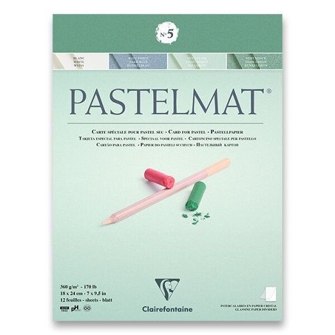 Blok Clairefontaine Pastelmat No.5 je profesionální papír speciálně vyvinutý pro práci s pastely. Pastel k tomuto papíru výborně přilne a není tedy nutný fixační prostředek. Papír pojme větší množství pastelu a umožňuje nanášení mnoha vrstev. Blok obsahuje 12 listů ve 4 odstínech s gramáží 360 g/m2.