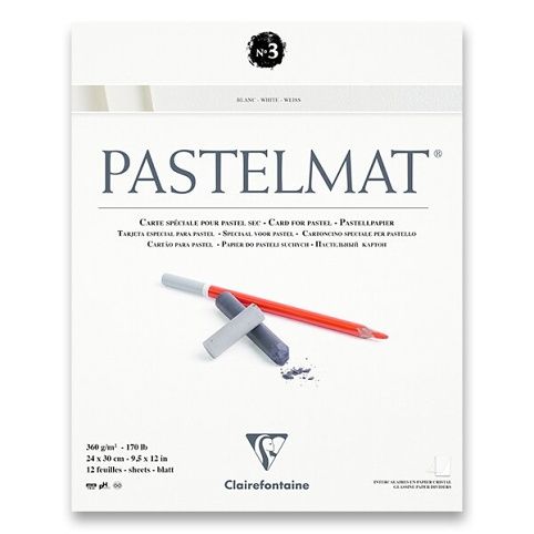 Blok Clairefontaine Pastelmat White No.3 je profesionální papír speciálně vyvinutý pro práci s pastely. Pastel k tomuto papíru výborně přilne a není tedy nutný fixační prostředek. Papír pojme větší množství pastelu a umožňuje nanášení mnoha vrstev. Blok obsahuje 12 listů v bílé barvě s gramáží 360 g/m2.