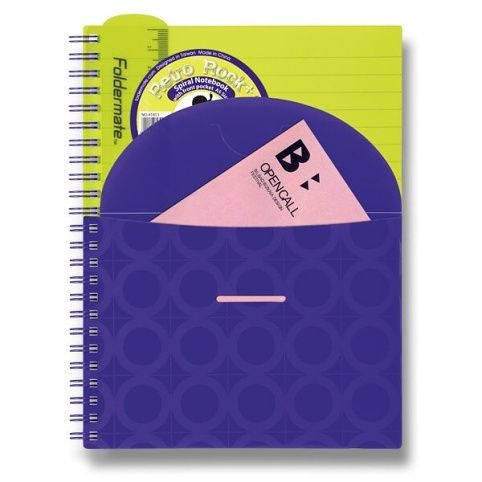 Kroužkový blok s boční dvojitou spirálou z tvrzeného polypropylenu. Praktické uzavírání na gumičku, přední kapsa a vyjímatelné pravítko, 20 cm. Papír 80 g/m2. Formát: A5, 80 listů, linkovaný