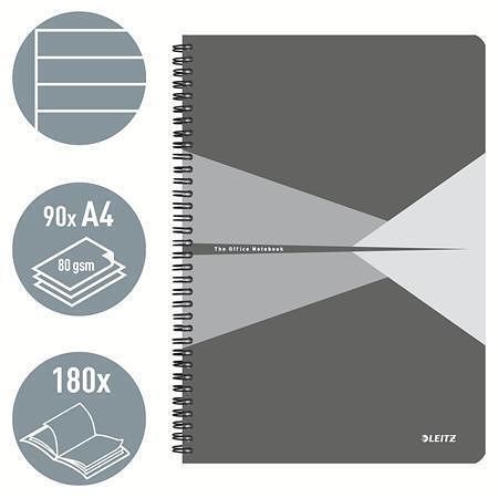 Blok "Office", šedý, drátěná kroužková vazba, A4, linkovaný, 90 listů, laminovaný povrch,