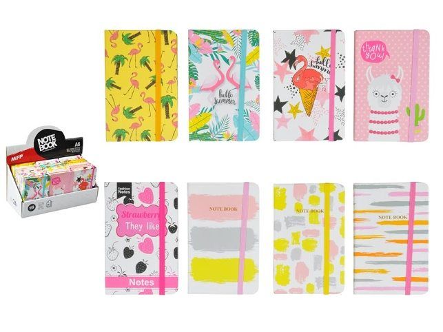 Designový bloček praktických rozměrů. Má gumku, která zamezí nechtěnému otevření. Na výběr z 8 motivů - plameňáci, jahody, lama, abstraktní motivy. Blok A6 s gumkou, 96 listů s linkami, papír 70g.