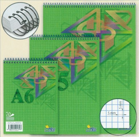 Poznámkové bloky se spirálou na horní straně, snadné listování a přetáčení listů. Listy jsou vyrobeny z kvalitního bezdřevého papíru.