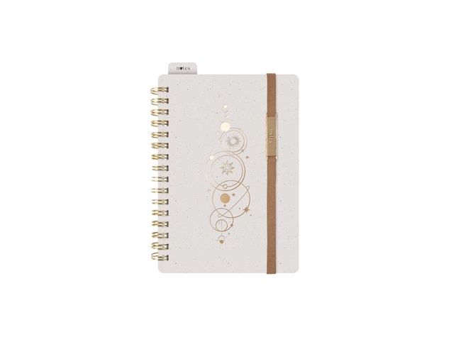 Designový poznámkový blok ve formátu A6 s linkovanými stránkami, spirálovou vazbou a praktickou gumičkou je ideální pro záznamy na cestách nebo každodenní použití. Obálka v jemné krémové barvě je zdobena zlatým motivem vesmírných symbolů, který bloku přináší jedinečný a vkusný vzhled. Spirálová vazba umožňuje snadné otáčení stránek, zatímco praktická gumička drží blok bezpečně zavřený, aby byly vaše poznámky chráněny. Záložka s nápisem „notes“ vám usnadní orientaci a poskytne rychlý přístup k důležitým stránkám. Díky kompaktnímu formátu se blok snadno vejde do kabelky nebo batohu, takže ho můžete mít vždy po ruce. Formát: A6 Barva: krémová Počet listů: 80, s linkami Motiv: vesmírné symboly Gramáž listů papíru: 80 g/m2 Uvedená cena je za 1 ks.