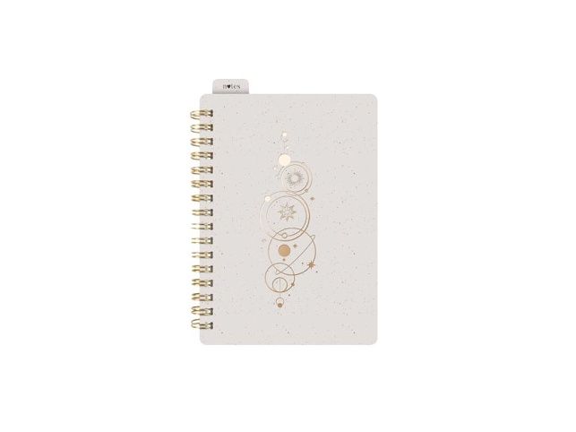 Designový poznámkový blok ve formátu A6 s linkovanými stránkami, spirálovou vazbou a praktickou gumičkou je ideální pro záznamy na cestách nebo každodenní použití. Obálka v jemné krémové barvě je zdobena zlatým motivem vesmírných symbolů, který bloku přináší jedinečný a vkusný vzhled. Spirálová vazba umožňuje snadné otáčení stránek, zatímco praktická gumička drží blok bezpečně zavřený, aby byly vaše poznámky chráněny. Záložka s nápisem „notes“ vám usnadní orientaci a poskytne rychlý přístup k důležitým stránkám. Díky kompaktnímu formátu se blok snadno vejde do kabelky nebo batohu, takže ho můžete mít vždy po ruce. Formát: A6 Barva: krémová Počet listů: 80, s linkami Motiv: vesmírné symboly Gramáž listů papíru: 80 g/m2 Uvedená cena je za 1 ks.