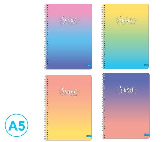 Vrchní desky potištěné a potažené laminem- zaoblené rohy- první stránka barevná- spirála na delší straně- formát: A5- počet listů: 60- vzor: linka- mix motivů
