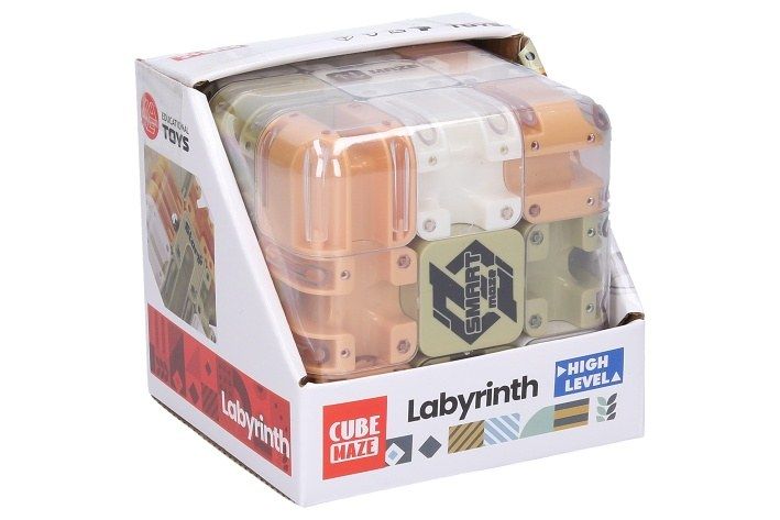 Bludiště kostka barevná. Velikost 8,5cm. Cílem hry je dostat kuličku do cíle pomocí otáčení vrstev kostky. návod součástí