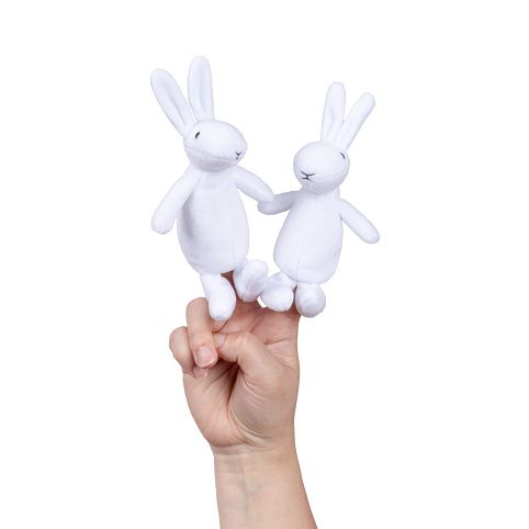 Bob a Bobek - králíci z klobouku jako prstoví maňásci. 2dílná sada textilních postaviček z příjemně měkoučkého materiálu. Bob 17cm a Bobek 15cm.