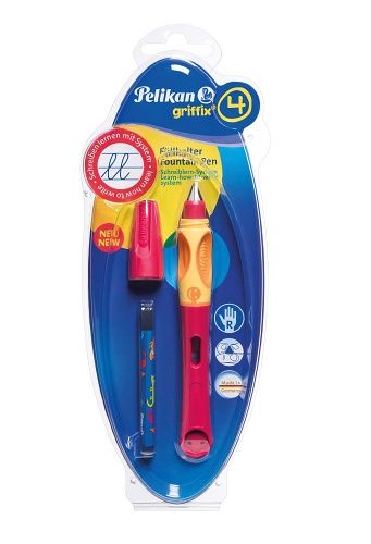 Bombičkové pero Griffix 4 pro leváky, ergonomicky tvarované držení, indikátor správného držení, okénko umožňující kontrolu množství spotřebovaného inkoustu, červené, na blistru s bombičkou
