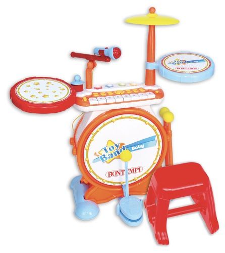 Součástí sady Bontempi je velký basový buben s pedálem, 2 menší bubny, činel, 2 paličky, mikrofon, keyboard a pohodlná stolička. Keyboard disponuje 8 klávesami, 4 volbami nástrojů, 4 doprovody, funkcemi nahrávání, echo, chord, učící funkcí a 8 demosongy. Samozřejmě si můžete přizpůsobit hlasitost a tempo. Keybord lze rovněž připojit k přehrávači MP3, iPadu či chytrému telefonu. Navíc si děti mohou pustit magickou světelnou show. Nechte rozvíjet hudební potenciál svých dětí díky digitální bicí sadě Bontempi.