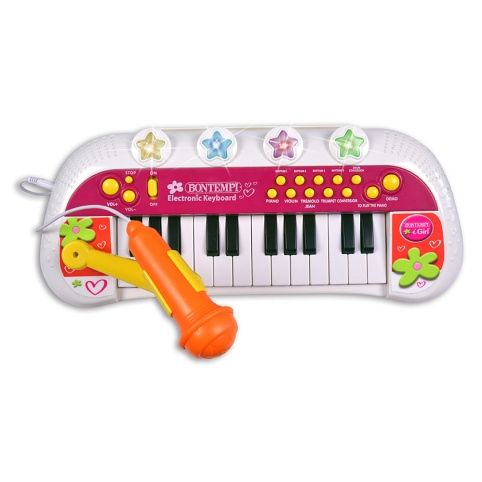 24 kláves, 5 zvuků, 5 rytmů, 5 zvuků bicích a 22 ukázek, nastavitelná hlasitost a tempo, nastavitelný mikrofon, magická světelná šou, automatické vypnutí klávesnice, rozměry: 42x20x60cm, od 4 do 12 let, baterie 3x LR6 nejsou součástí