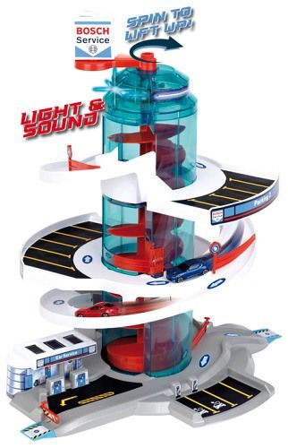 Garáž v licenci BOSCH s výtahem, který otáčí auta do různých úrovní. Garáž obsahuje světelné a zvukové efekty, 2 auta, spínače pro změnu jízdy, rampy a 4 čerpací místa. Výška garáže je 57 cm. Baterie nejsou součástí balení. Vhodné od 3 let.