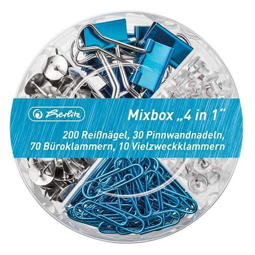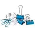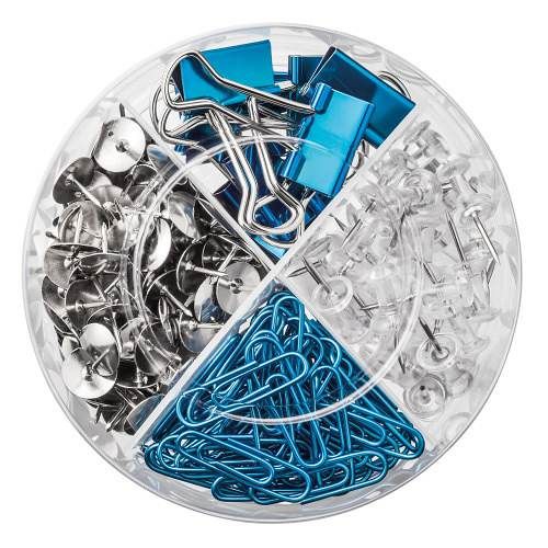 Box 4v1 Frozen Glam – potřeby do kanceláře, obsahuje: 10 ks modrých klipů, 70 modrých sponek, 30 transparentních napínáčků do nástěnky, 200 stříbrných plochých napínáčků