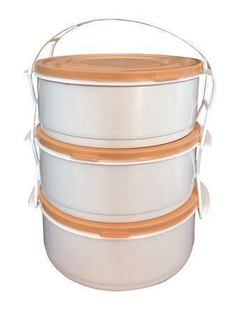 Třídílný plastový box na potraviny s různobarevnými víky a praktickou rukojetí, který drží tři části pohromadě během přepravy a zvedání.