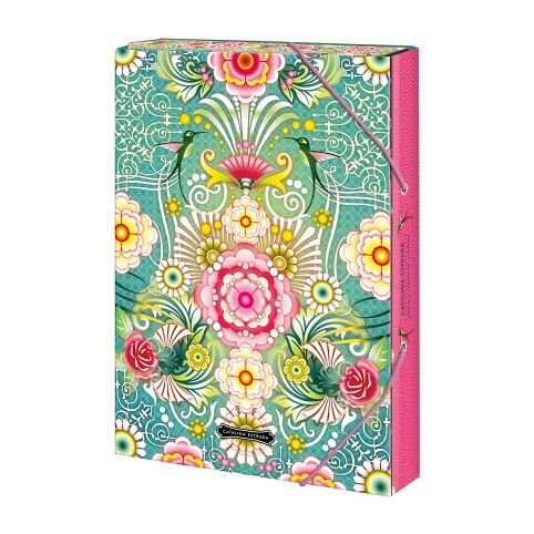 Box velikosti A4 na sešity a jiné dokumenty. Box je z tvrdého papírového materiálu uzavřen ze všech stran s PUV lakováním a jemným vnitřním potiskem. Box má gumičky v horní a dolní části, které brání samovolnému otevření. Box chrání vaše dokumenty a sešity před poškozením a navíc máte je všechny pěkně v jednom obale.