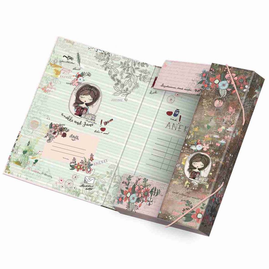 Školní box velikosti A5 na sešity a jiné dokumenty s motivem známého děvčátka Anekke z dílny španělské designérky. Box je z tvrdého papírového materiálu uzavřen ze všech stran s PUV lakováním, vnitřním potiskem a rozvrhem hodin. Box má gumičky v horní a dolní části, které brání samovolnému otevření. Školní box chrání sešity před poškozením a navíc, vaše školačka bude mít všechny sešity pohromadě.