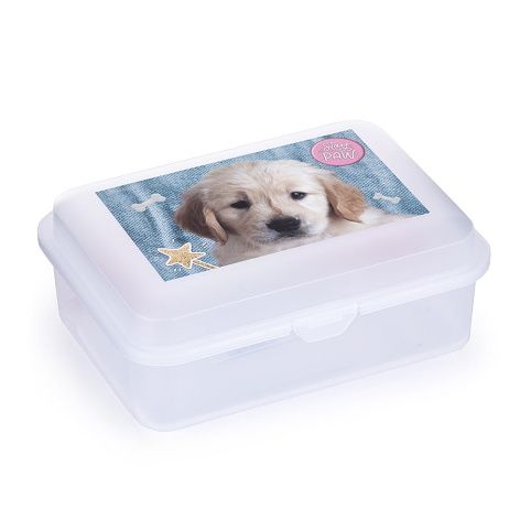Plastový box na svačinu s motivem psa. Vhodné do myčky, pro ohřev v mikrovlnce nechejte box otevřený.