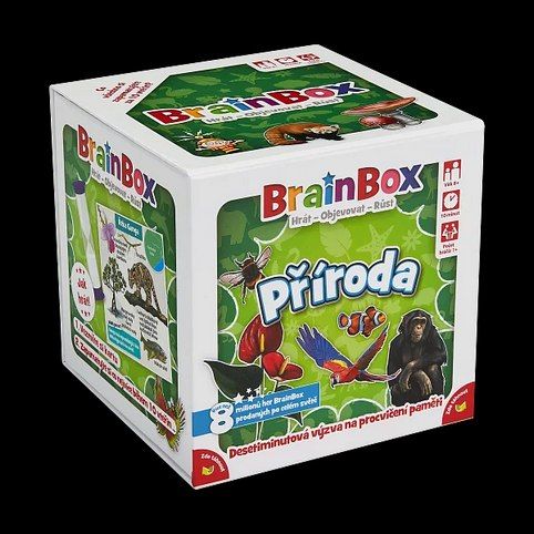 BrainBox Příroda obsahuje 55 hracích karet, které představují různé druhy živočichů a rostlin: od obojživelníků po pavouky, od koček po korýše, od nelétavých ptáků po ovoce a mnohem více. Na každé kartě jsou ručně malované obrázky divoce žijících zvířat a rostlin, u nichž jsou uvedena klíčová fakta. Obrázky vám doslova ožijí před očima.