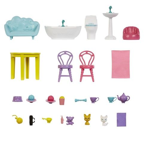 Když děti otevřou dveře Chelsea™ domu se skluzavkou, objeví nekonečné možnosti hraní. Dům pro panenky Chelsea™, je velikostně přizpůsobený pro panenky s výškou 15,24cm. Dům odhaluje různé prostory, které inspirují k hodinám vyprávění příběhů a tolika možnostem hry! Mezi hrací zóny patří ložnice, pokojíček pro domácí mazlíčky, kuchyň, koupelna, obývací pokoj, terasa, balkon, výtah a skluzavka, která vede do bazénku s míčky. Čeká vás tolik zábavy! Více než 15 doplňků pro vyprávění příběhů zahrnuje zvířátka, nábytek a další.