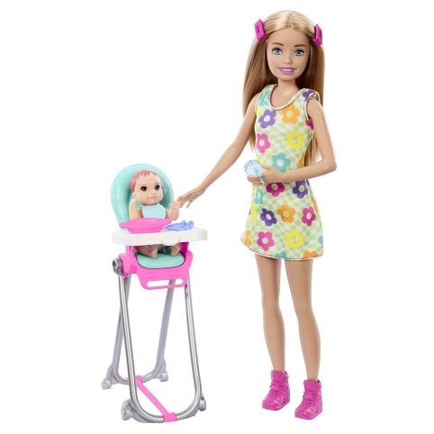 Panenky a herní sety Barbie® Chůva™ umožňují dětem prozkoumat jejich pečovatelskou povahu v roli chůvy s panenkou Skipper™ nebo kamarádkou, panenkou miminka nebo batolete a více než 10 doplňky. Tento set je tematicky zaměřený na krmení miminka a obsahuje