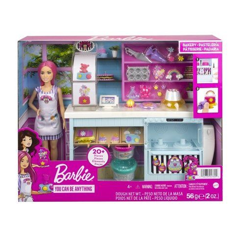 Prozkoumejte svět vedení pekárny s herním setem Barbie® Pekárna! Děti milují pečené dobroty a s tímto herním setem mohou provozovat pekárnu a vyrábět lahodné dorty a další pochoutky! Herní set obsahuje panenku Barbie® pekařku vysokou 30 cm s parádními růžovými vlasy a v roztomilých pruhovaných šatech. Pekařská stanice má tři hrací plochy na pečení, zdobení a vystavování a navíc se dodává s více než 15 doplňky. Děti mohou použít dva druhy těsta (růžové nebo modré) a vložit je do trouby, zatáhnout za páku a sledovat, jak koláče vykynou! Poté mohou pomocí razítkovače ozdobit dort na podstavci a použít také příslušenství na zdobení dortů! Panenka neumí samostatně stát. Barvy a vzhled výrobku se mohou lišit. Skvělý dárek pro děti od 3 let.