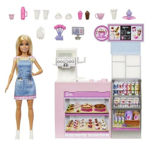 S panenkou Barbie® a jejím herním setem Kavárna s panenkou můžete servírovat tu nejlepší kávu - a snít ty nejkrásnější sny - na světě! Kavárenský pult obsahuje kávovar na kávu / smoothie s různými příchutěmi, stačí otočit kolečkem a vybrat si. V nabídce j