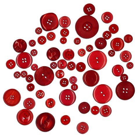 Dekorační knoflíky, mix velikostí a motivů. Balení obsahuje 40g knofílků v červené barvě.