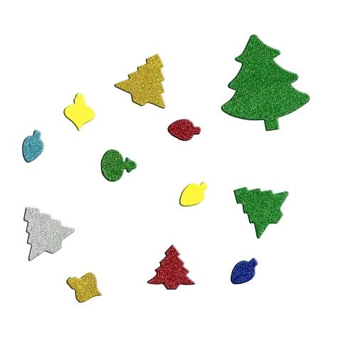 Samolepící pěnové stromečky, ozdobyčky s brokátem na sklo, dveře atp.