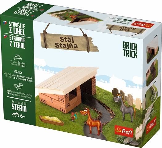 Bricks Tricks - stavění z reálných cihliček a dřevěných desek. Obsah balení: pravé cihly, lepidlo, dřevěné desky, dekorativní prvky, figurky, stojan, nálepka a návod