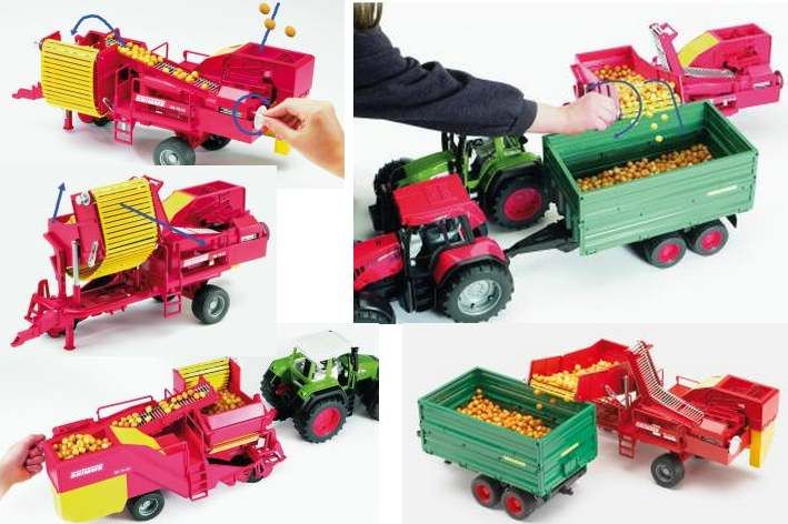 BRUDER 2130 - Kombajn na brambory Grimme SE 75-30. Velice pěkný a velký model bramborového kombajnu Grimme - BRUDER 02130, který lze připojit k libovolnému traktoru BRUDER. Obsahuje sadu malých plastových brambor, všechny části jsou pohyblivé a funkční.