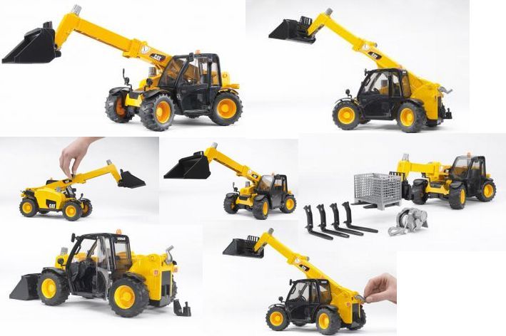 BRUDER 02141 Nakladač CAT manipulátor s výsuvným ramenem - transportní stroj - manipulátor s mnoha ovládacími prvky - klička v zadní části stroje ovládá zvedání ramene, další dva ovládací prvky zajišťují výsuv ramene až do délky 40 cm a naklápění přední lžíce. Dále lze ovládat zatáčení stroje pomocí kolečka na pravé straně kabiny (zatáčejí obě nápravy protisměrně, což umožňuje nakladači zmenšit poloměr zatáčení). Kabina stroje je zasklená, otevíratelná. Nakladač je vybaven závěsným zařízením. Lze použít výměnné nástavce ze sady č. 02008. Rozměry 335 x 142 x 140 mm. Od 3let.