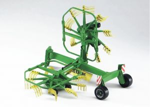 BRUDER 02216 - KRONE obracečka – funkční zařízení, které se dá samostatně sklápět. Má pohyblivé hroty, které se pohybují během jízdy a výklopnou podpěrnou nohu. Lze připojit ke všem traktorům a strojům serie 2000, 2100 a 3000.