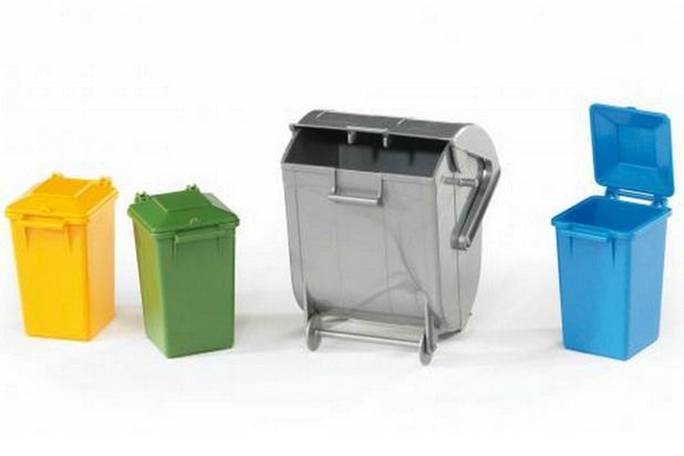Balení zahrnuje 3 náhradní popelnice o velikosti 7,5 x 4,5cm a jeden kontejner 11 x 9cm. Měřítko 1:16. Věrná plastová kopie skutečných popelnic a kontejneru. Velice kvalitní zpracování německé firmy BRUDER do nejmenších detailů, vyrobeno v Německu z vysoce kvalitního ABS plastu.