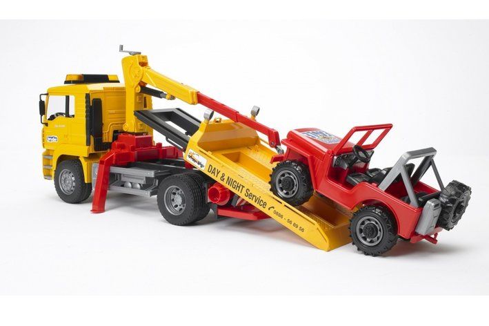 BRUDER 02750(2750) MAN TGA odtahová služba + jeep - velký odtahový vůz včetně jeepu. Sklopná plošina, funkční manipulační ruka za kabinou. Součástí řetězy s úchytnými segmenty na manipulaci s jeepem. Sklopná kabina, měkké pneumatiky. Lze instalovat zvukový a světelný maják 2801 a též přední radlice 2575 (kategorie BRUDER - přívěsy, pluhy, lžíce). Rozměry 505x185x255 mm. Od 3let