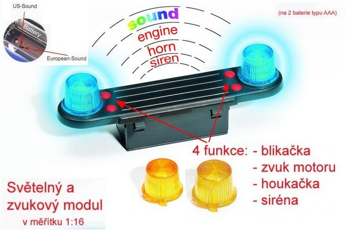BRUDER 2801 - světelný a zvukový modul se 4 funkcemi = maják-blikačka + zvuk motoru + houkačka + siréna. Tento doplněk ozvučí Váš vůz MAN, VOLVO, Mercedes Benz, MB ACTROS, MB UNIMOG nebo MB SPRINTER. Instaluje se zasunutím do střešního otvoru kabiny. Může se kdykoli vyměnit. Po stisku jednoho z horních tlačítek imituje zvuk motoru náklaďáku, houká, spustí sirénu a nebo bliká bez nebo s ozvučením. Tyto 4 funkce se zapínají stiskem malých gumových tlačítek ze shora. Navíc lze pomocí vnitřního přepínače volit mezi evropským či zámořským výstražným signálem. Je možné též měnit barevné varianty majáků - oranžové nebo modré - jednoduchou výměnou plastového majáčku. Zdroj: 2 x baterie typ AAA - součástí výrobku.
