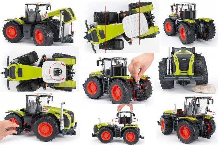BRUDER 03015 TRAKTOR CLAAS XERION 5000 (Nejžhavější novinka 2011) - Propracovaný model traktoru s mnoha funkcemi. Otevíratelný motorový prostor, výškově nastavitelné závěsné zařízení s možností připojení různých vleků a příslušenství, zasklená kabina, otočná kabina, otevírací dveře, funkční řízení všech kol pomocí prodlouženého volantu skrz střechu nahoru.