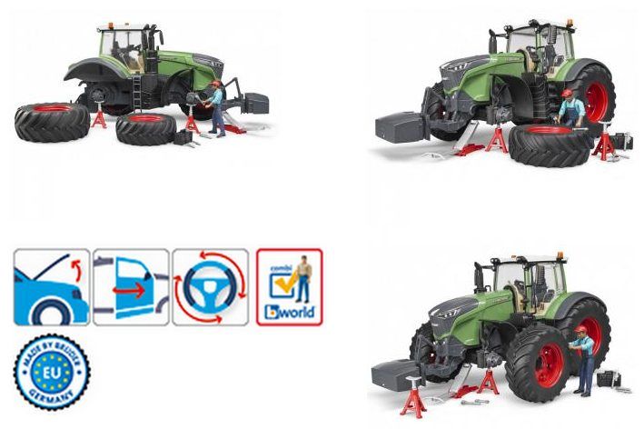 Specifikace lze kombinovat s modely, figurkami a příslušenstvím BRUDER ovládá se buď volantem uvnitř, anebo druhým - prodlouženým volantem, který je součástí balení prodloužený volant se zasune do stávajícího volantu skrze otvor ve střeše, což příjemně usnadňuje ovládání stroje otevírání kapoty motoru a dveří odnímatelné čení závaží zasklená kabina závěsné zařízení se zdvihacím mechanismem umožňuje připojení různých vleků a přívěsů profilované pneumatiky součástí je figurka opraváře s dílenskými doplňky - zvedák, 2 podpěry a kufr s nářadím traktor byl vyroben v měřítku 1:16 ke skutečnému traktoru jako věrná plastová kopie jde o velice kvalitní zpracování německé firmy BRUDER do nejmenších detailů precizní výrobek bez jakýchkoli otřepů či přetoků vyrobeno z vysoce kvalitního ABS plastu - pružného plastu s lesklým povrchem