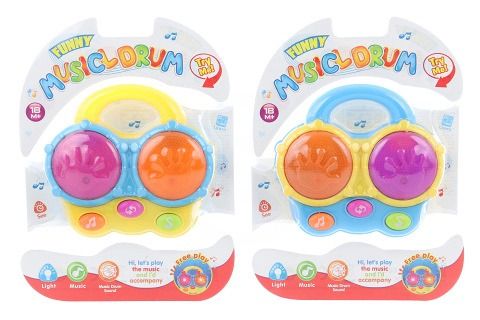Plastové bubínky pro nejmenší. Po zmáčknutí tlačítek svítí a vydávají zvuky. Napájení na 2 AAA baterie (jsou součátí balení). Rozměry bubínků cca 12 x 10,5 x 4 cm. Rozměry balení cca 17 x 22 x 4 cm. Věk 18m+