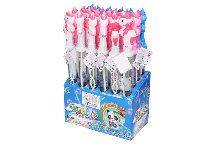 Bublifuk jednorožec. Objem 100 ml. Velikost 38 cm. 24 ks display box. 4 varianty - růžová, fialová, bílá, modrá.