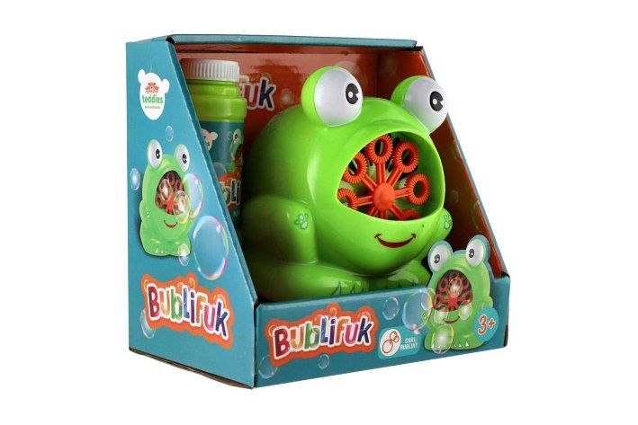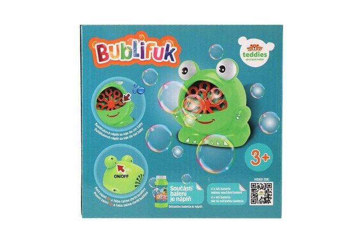 Po zmáčknutí spínače začne žábička chrlit bubliny. Součástí balení je náplň. Baterie 4 x AA nejsou součástí balení.