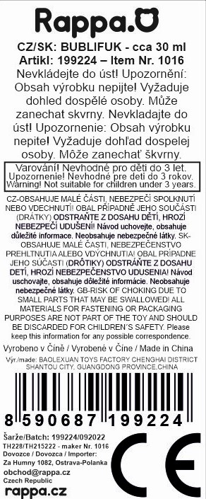 Bublifuk ve tvaru propisky má obsah 30 ml. Foukátko je součástí víčka. S tímto parádním kouskem zažiješ zaručeně spoustu legrace!