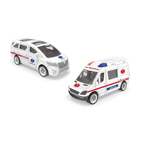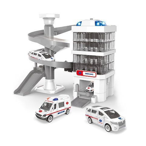 Nemocniční patrová budova se sjezdem. Střecha budovy disponuje majáčkem, který po zapnutí vydává reálné zvuky a bliká. K této funci je potřeba použítí 3 ks baterií typu LR44, které jsou uvnitř výrobku. Součástí této sady jsou 2 autíčka ambulance ve velikosti 7,5 cm.