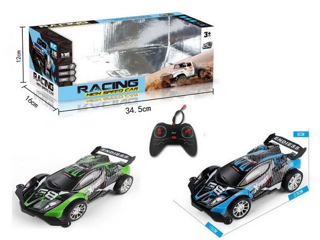 Bugina RC na dálkové ovládání. Rozměry 22,5x11x4,8 cm. Světelné efekty. 4xAA baterie do auta, 2xAA do ovladače nejsou součástí. 2 varianty - zelená, modrá.