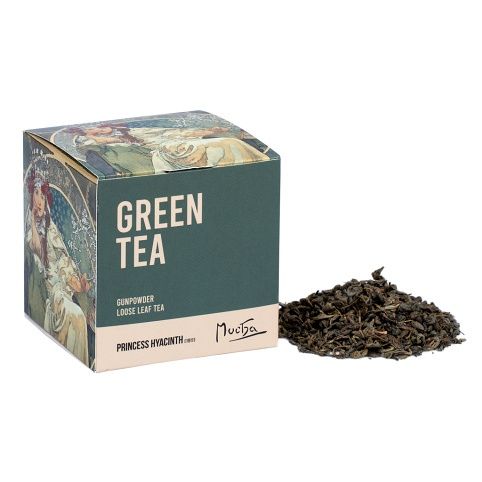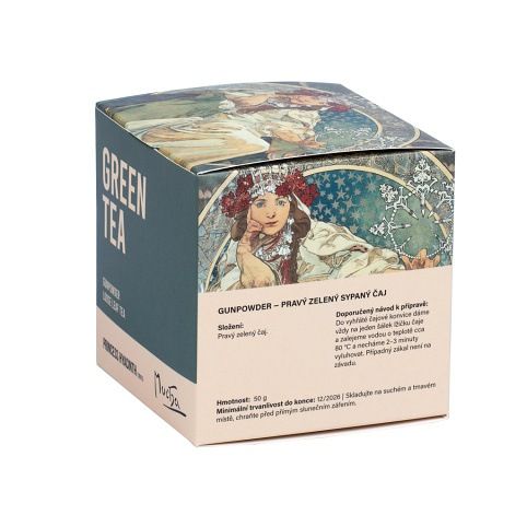 Zelený sypaný čas v krabičce s potiskem Alfonse Muchy.
