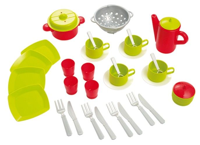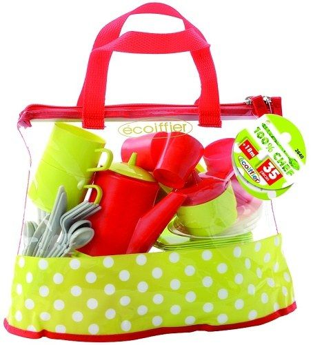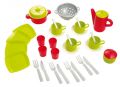 Velká průhledná taška se zipovým zavíráním obsahuje čtyři talíře, sadu čtyř příborů, čtyři pohárky, čtyři plastové hrníčky s podšálky, konvičku, cukřenku, síto a hrnec s pokličkou. Vše plastové. Vhodné pro děti od 18 měsíců. Velikost tašky 29x12x30 cm.