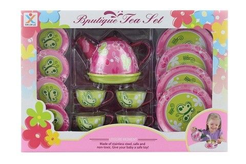 Krásná barevná sada plechového čajového setu a motýlky. Balení obsahuje konvičku, 4 šálky, 4 podšálky a 4 talířky. Baleno v krabici. Rozměry balení cca 31,5x22x9 cm. Věk 3+