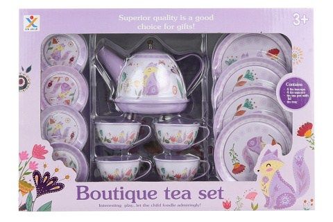Plechový čajový set. Balení obsahuje konvičku, tác, 4 hrnečky, 4 podšálky a 4 talířky. Rozměry balení cca 31,5 x 22 x 9 cm. Věk 3+