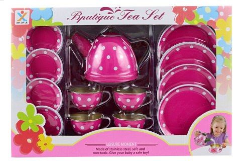 Čajový set obsahuje: 1x konvička cca 11cm, 4x hrníček s podšálkem, 4x talířek a 1x tác. Rozměry balení cca 32 x 22 x 9 cm. Věk 3+