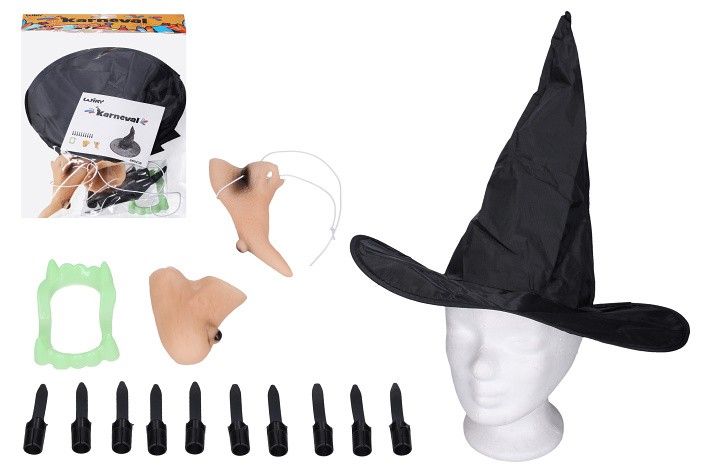 Set obsahuje: bradu na gumičce, nos na gumičce, 10 nasazovacích prstů s nehty, zuby a velký čarodějnický klobouk