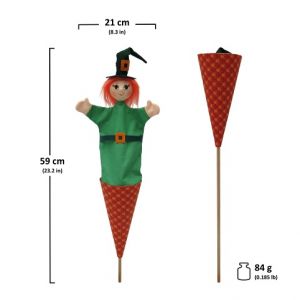 Kornoutový maňásek "3v1" = loutka+maňásek+schránka na drobnosti. Ovládá se dřevěnou tyčkou, kterou také schováte celou postavičku do kornoutu. Otvorem na zádech ovládáte ruce, tak jako u maňásků, nebo vložíte drobné dárky do kornoutu.
