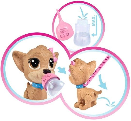 CCL Pejsek čivava Pii Pii umí dělat loužičky. Dejte pejskovi napít z lahvičky a vyrazte na procházku. Když trošku zatlačíte na vodítko, pejsek pokrčí zadní nohy a udělá loužičku. Balení obsahuje pejska, vodítko a lahvičku na pití. Velikost pejska 20 cm.